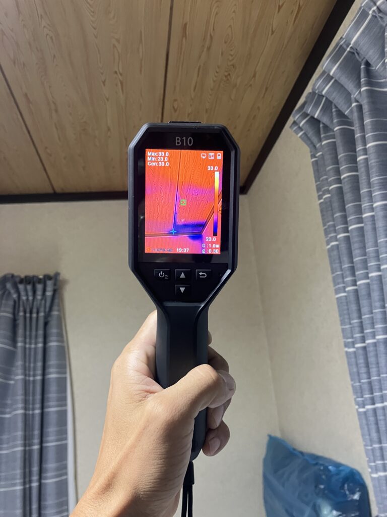 ベッドの上から垂れていました。サーモグラフィカメラで確認し(青い部分に雨が溜まっています)